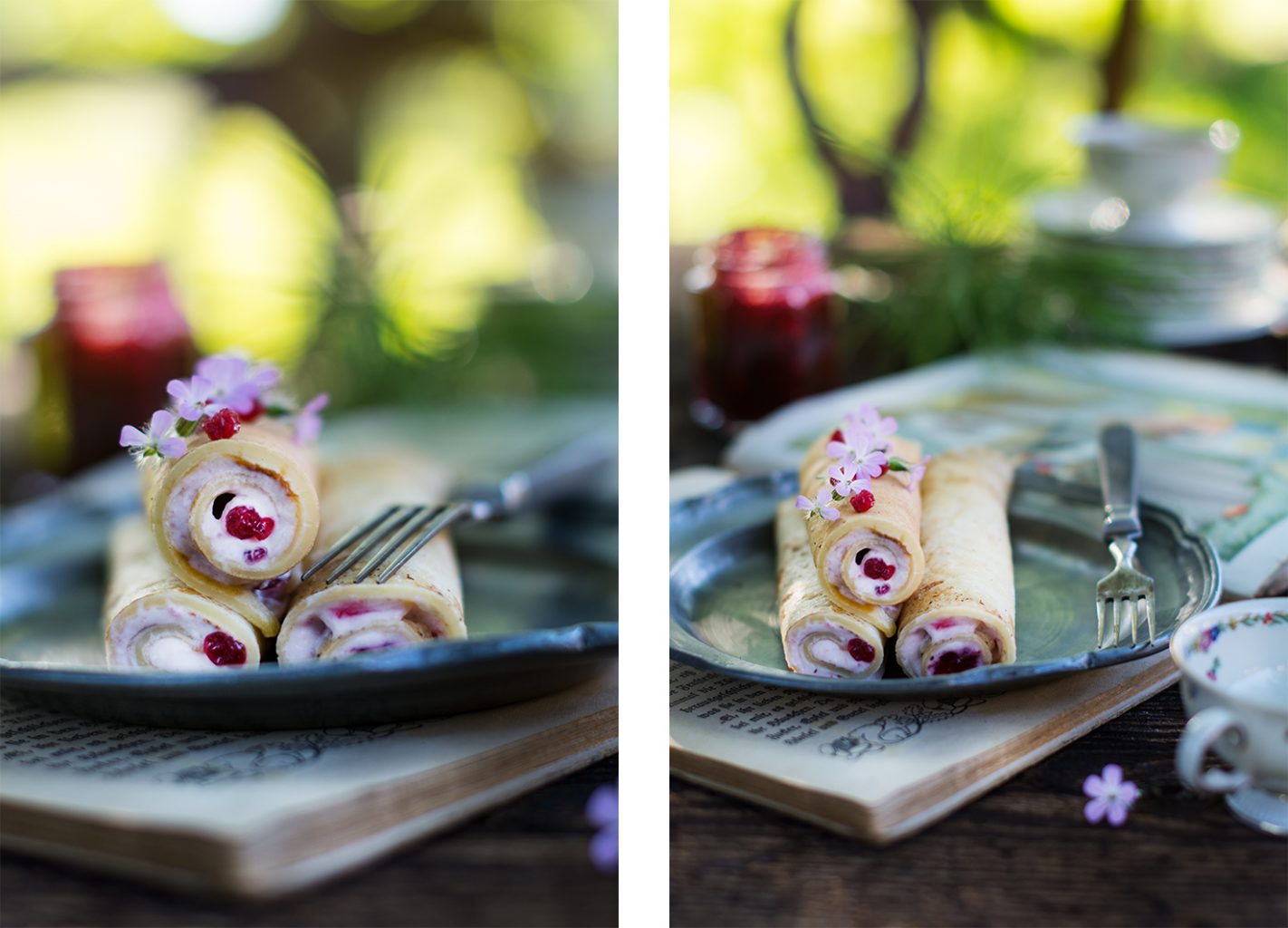Geschlagenes Obers einfach vermischt mit etwas Zucker und Preiselbeeren. Diese Kombination ist einfach unglaublich! Und schmeckt unendlich gut. Vor allem wenn die Palatschinke noch lauwarm ist und die Füllung leicht zu schmelzen beginnt.